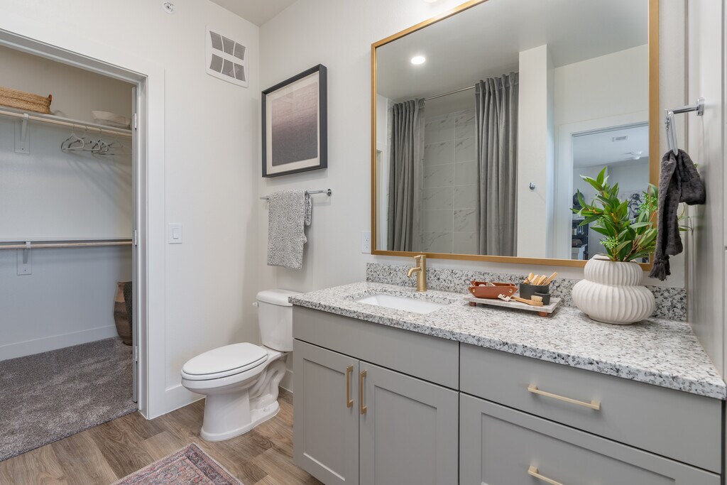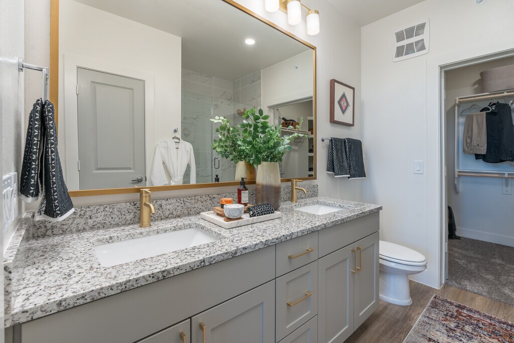 At Aura Avant, weve taken a bold, refined new approach to community design. Experience modern sophistication in every detail, including spacious walk-in closets with custom wood shelving. Our chef-inspired kitchens feature slide-in ranges, sleek shaker-style cabinets with under-cabinet lighting, butler pantry*, and granite countertops with under-mount sinks. Inside our bathrooms, youll enjoy high-end conveniences like double vanities* and luxuriant soaking tubs*.