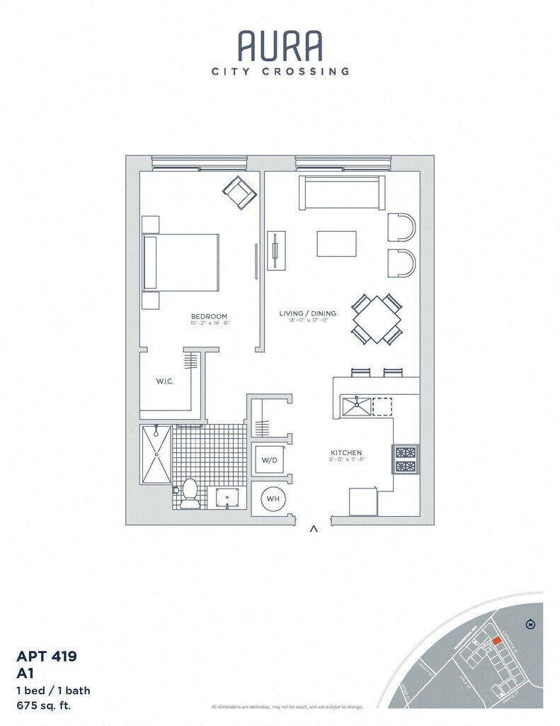 A1 - Floorplan 1 Apartment Unit: 418Apartment Model: A11 Bedroom, 1 Bath, 675 sq ftAvailable Now![]()