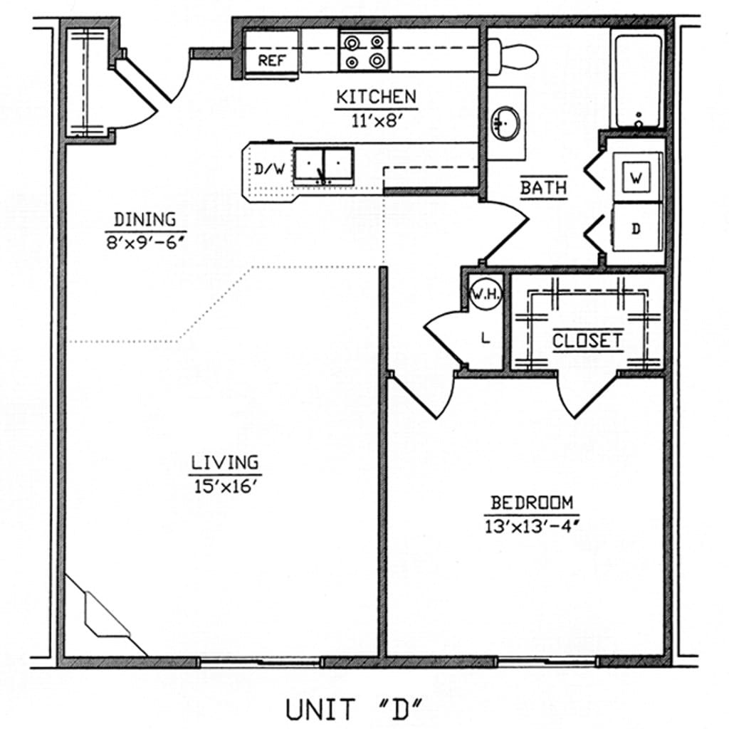 Apartment Model: D$1,0001 Bedroom, 1 Bath, 600 sq ftUnavailableD - Floorplan 1 2 Bedrooms