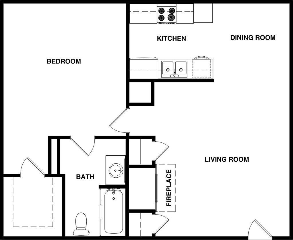 2 Beds, 1 bath - Floorplan 1 2 Beds, 1 bath