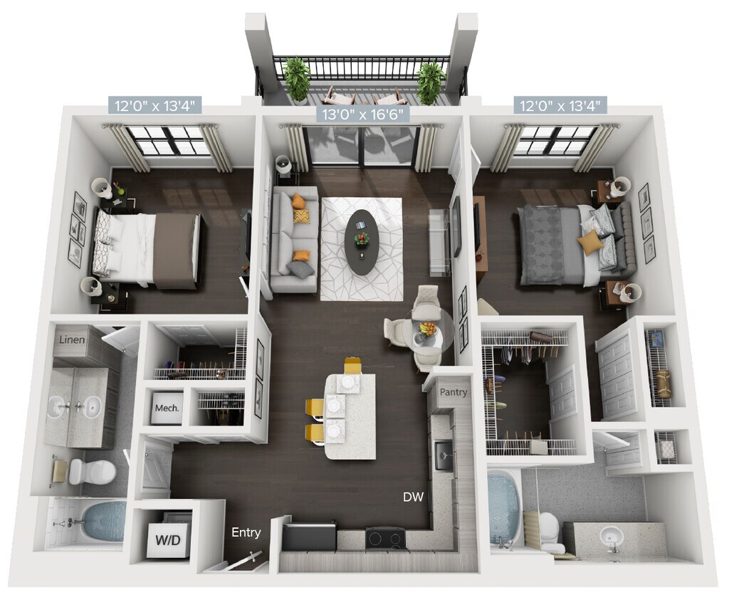 2 Beds, 2 Baths, 1339 sq ftAvailable NowLargest 2 BedroomThis is the largest 2 Bedroom at this PropertyModel Gallery
