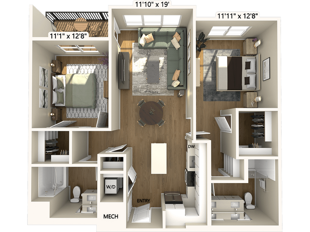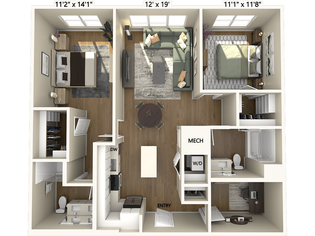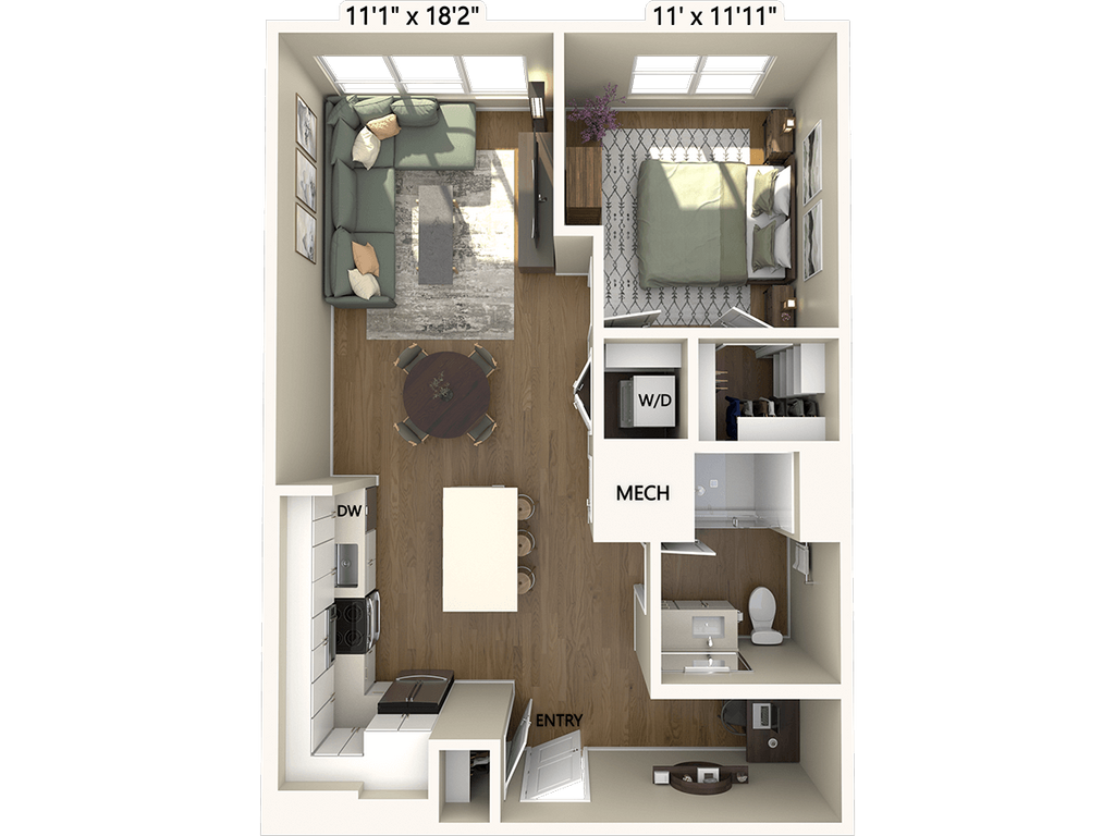 Apartment Model: A2-697-1-1From $2,7111 Bedroom, 1 Bath, 697 sq ftAvailable March 18, 2026Floor plans are artist's rendering. All dimensions are approximate. Actual product and specifications may vary in dimension or detail. Not all features are available in every rental home. Please see a representative for details.