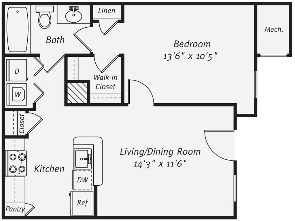 Apartment Model: A1-603$2,1431 Bedroom, 1 Bath, 603 sq ftAvailable June 16, 2026Floor plans are artist's rendering. All dimensions are approximate. Actual product and specifications may vary in dimension or detail. Not all features are available in every rental home. Please see a representative for details.