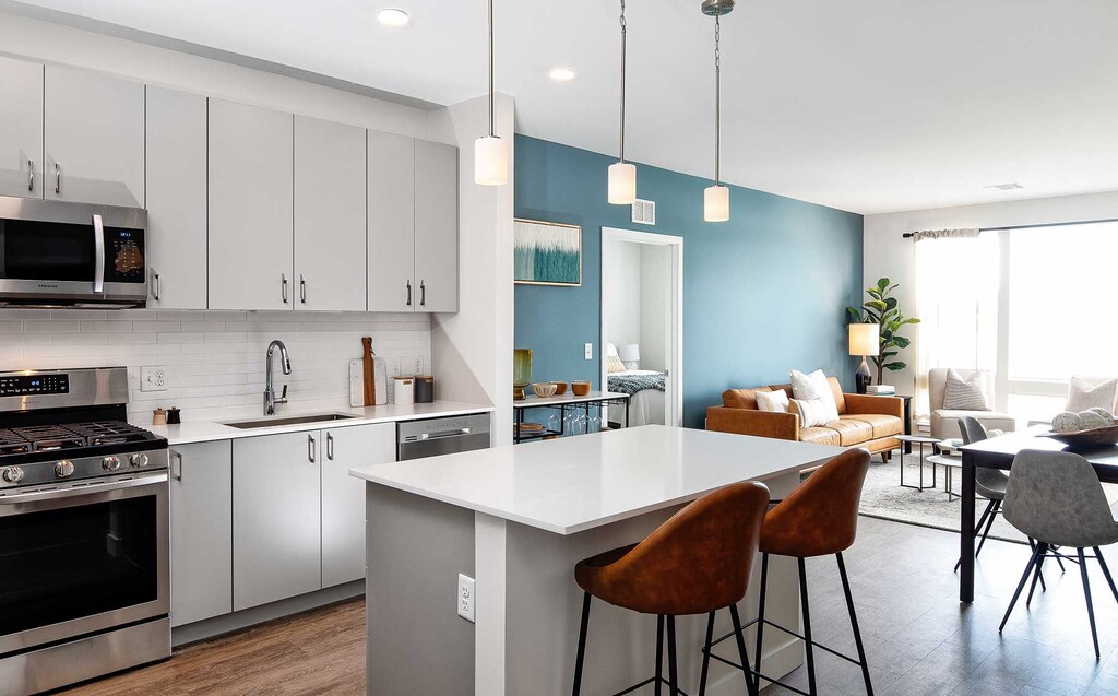 Modern, open concept kitchens feature quartz countertops, stainless steel appliances and backsplash. Live your life effortlessly with amenities that include a state-of-the-art fitness center with professional grade cardio and strength equipment, 2,500 square feet of co-working space and multiple outdoor courtyards that house a swimming pool and sundeck, barbeque grills, dining areas and gaming areas. Our community is centrally located at Woburn Village, a mixed-use concept lifestyle center that includes retail, restaurants, and entertainment.