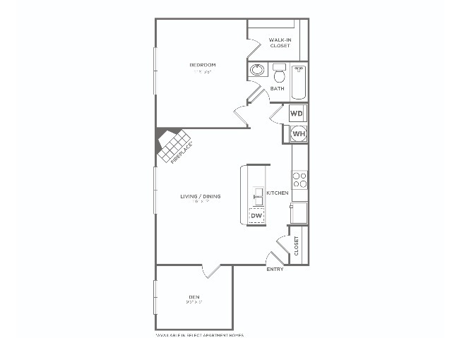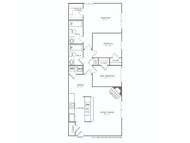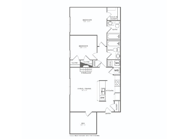 Apartment Model: One Bedroom One Bath with Den (734 SF)From $1,9031 Bedroom, 1 Bath, 734 sq ftAvailable NowFloor plans are artist's rendering. All dimensions are approximate. Actual product and specifications may vary in dimension or detail. Not all features are available in every rental home. Prices and availability are subject to change. Base rent is based on monthly frequency. Additional fees may apply, such as but not limited to package delivery, trash, water, amenities, etc. Deposits vary. Please see a representative for details.