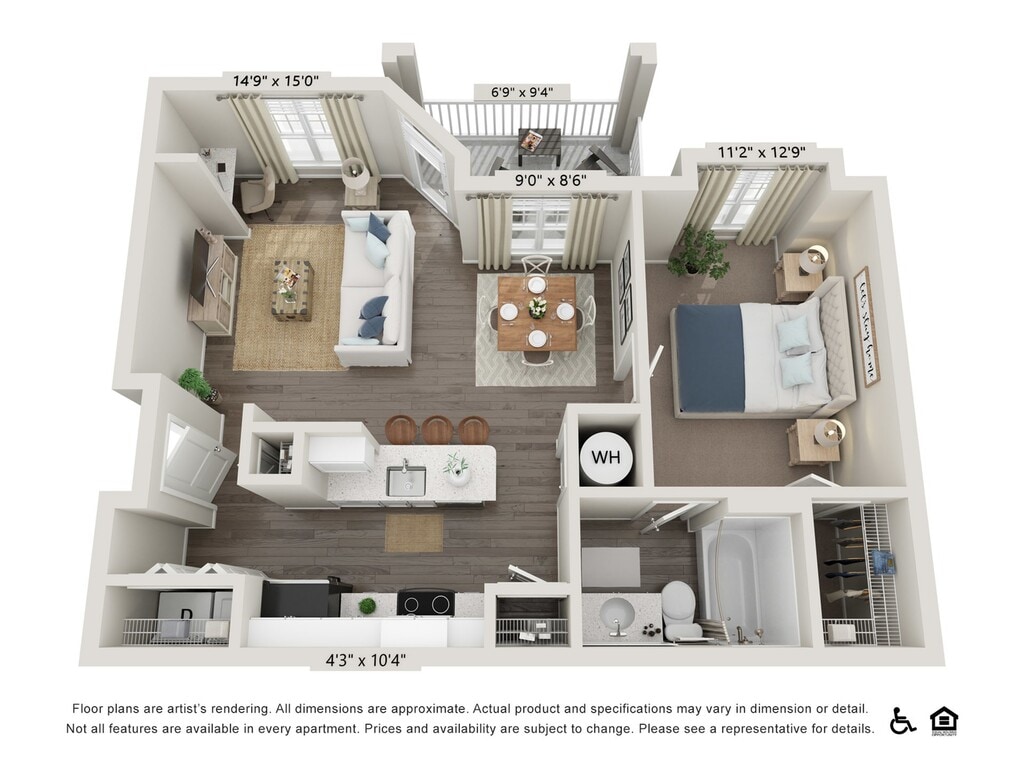 Spruce (875 SF) - Floorplan 9 Floor plans are artist's rendering. All dimensions are approximate. Actual product and specifications may vary in dimension or detail. Not all features are available in every rental home. Prices and availability are subject to change. Base rent is based on monthly frequency. Additional fees may apply, such as but not limited to package delivery, trash, water, amenities, etc. Deposits vary. Please see a representative for details.