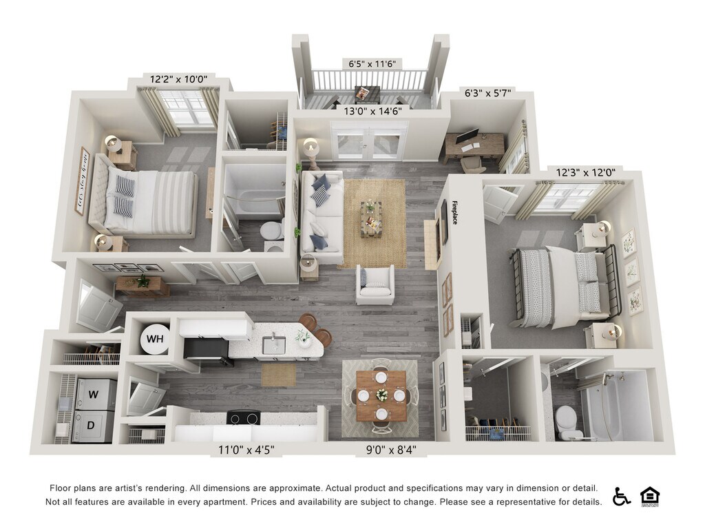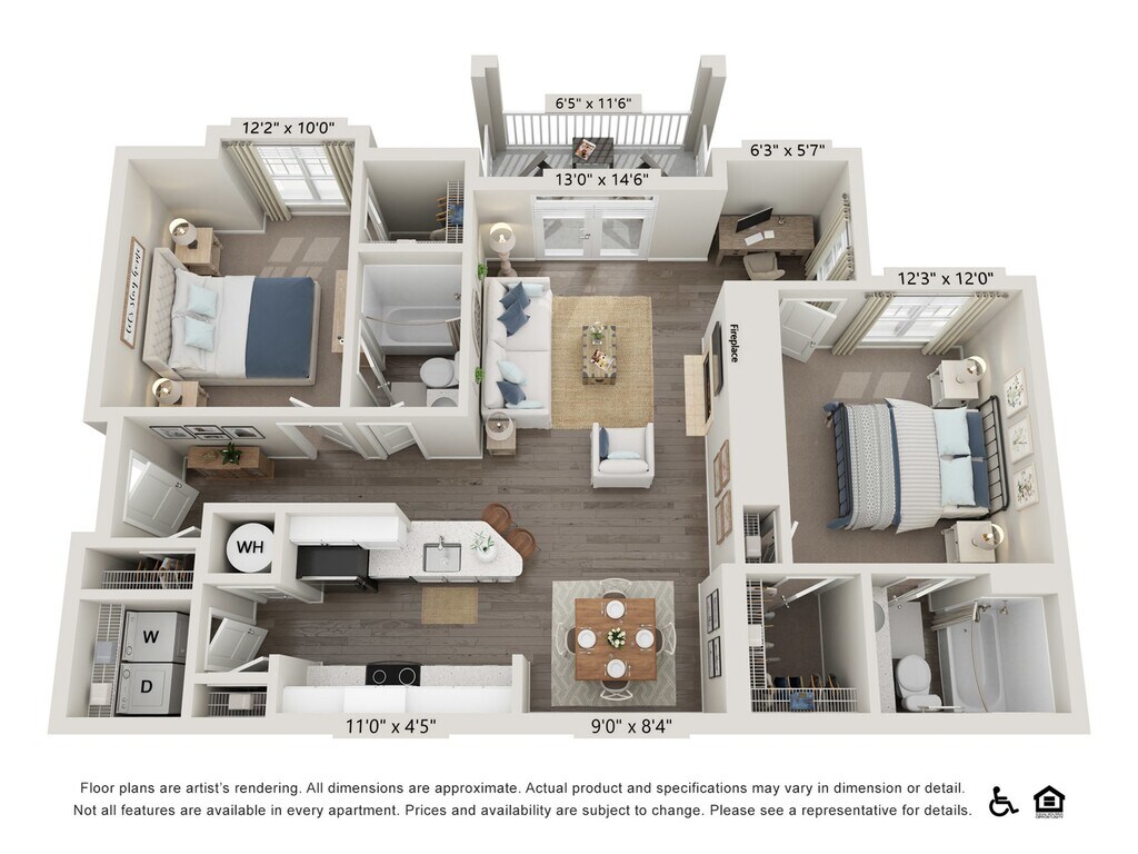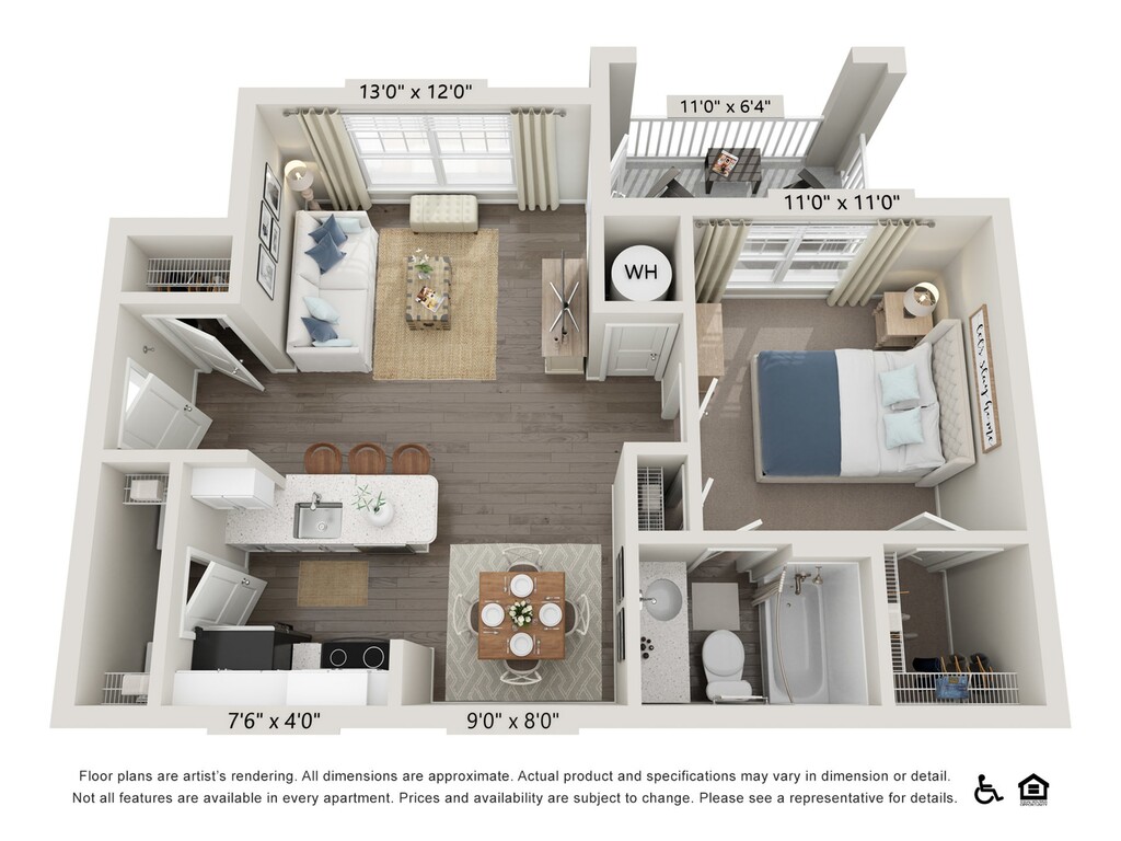 Oak (736 SF) - Floorplan 8 Floor plans are artist's rendering. All dimensions are approximate. Actual product and specifications may vary in dimension or detail. Not all features are available in every rental home. Prices and availability are subject to change. Base rent is based on monthly frequency. Additional fees may apply, such as but not limited to package delivery, trash, water, amenities, etc. Deposits vary. Please see a representative for details.