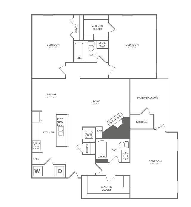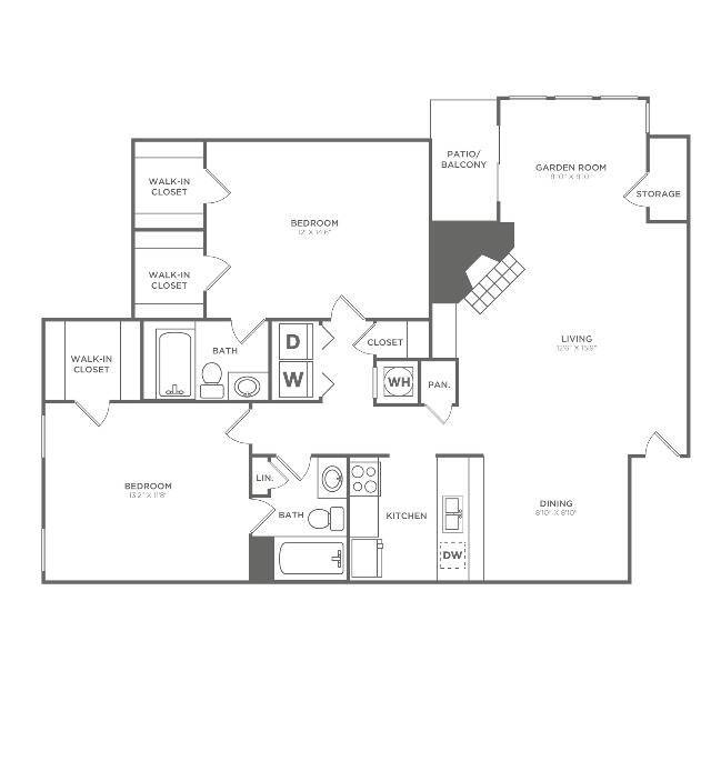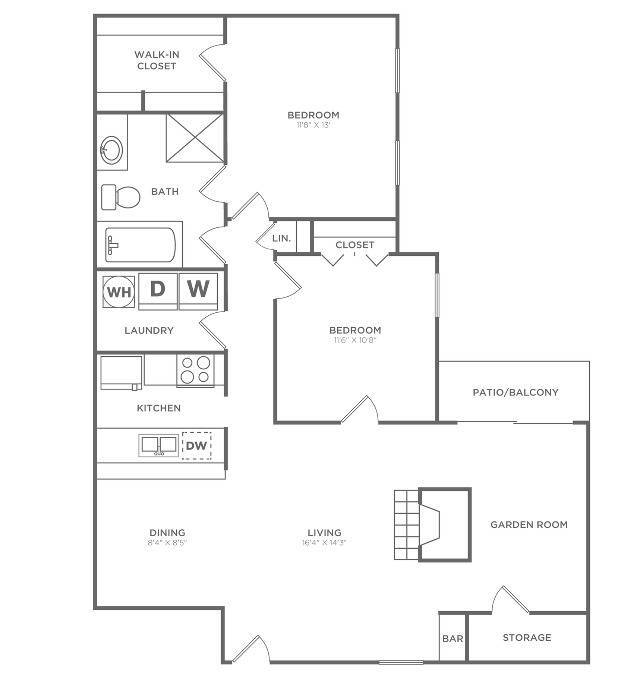 Apartment Model: Two Bedroom One Bath (1,200 SF)From $1,6092 Bedroom, 1 Bath, 1200 sq ftAvailable NowFloor plans are artist's rendering. All dimensions are approximate. Actual product and specifications may vary in dimension or detail. Not all features are available in every rental home. Prices and availability are subject to change. Base rent is based on monthly frequency. Additional fees may apply, such as but not limited to package delivery, trash, water, amenities, etc. Deposits vary. Please see a representative for details.