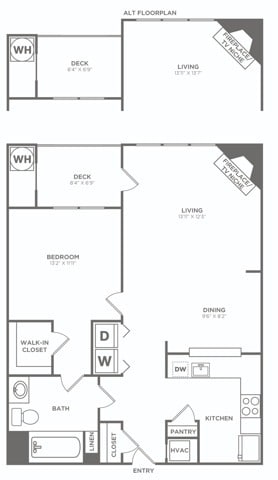 One Bedroom One Bath (610 SF) - Floorplan 1 2 Bedrooms