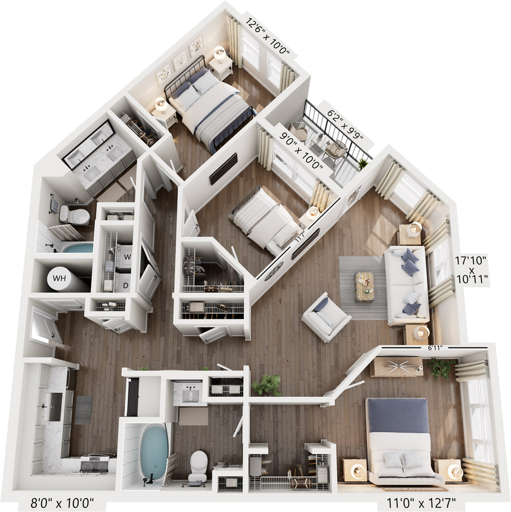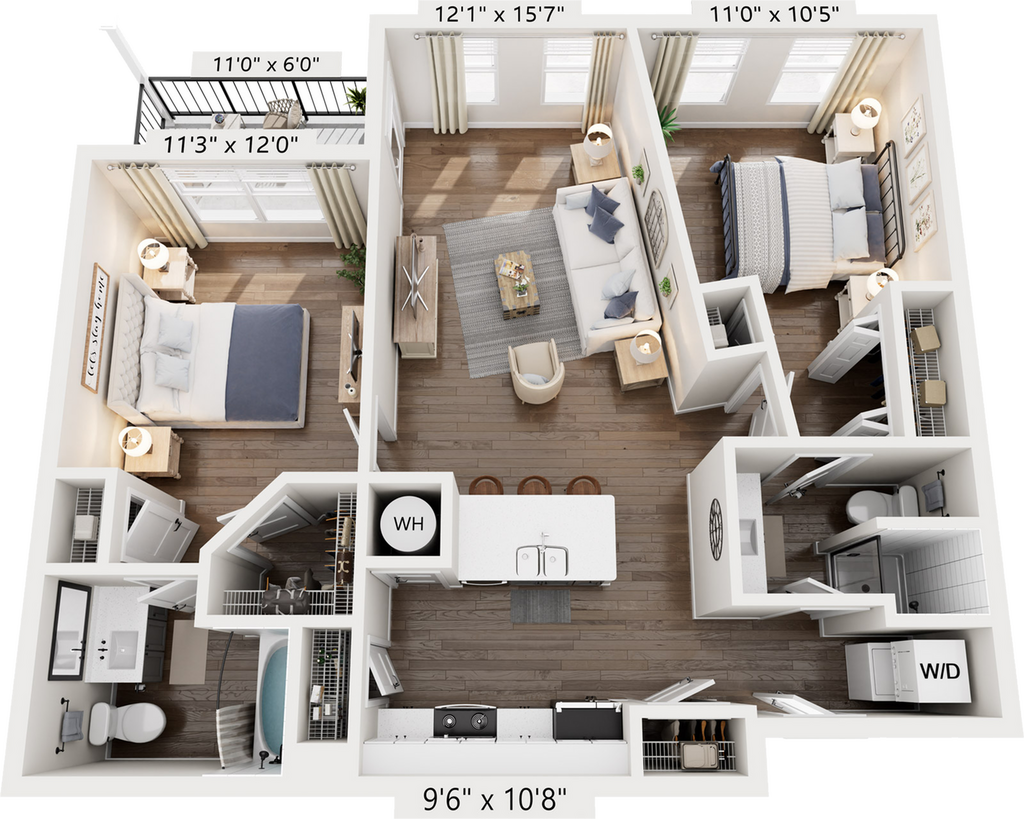 - Flexible, open layouts in one-, two-, and three-bedroom floor plans.