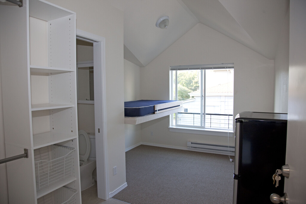 Avenida aPodment® micro studio apartments in the heart of Seattle's University District offer incredible value. Situated between Lake Union and the U District’s bustling hub known as “The Ave,” it offers up smartly crafted studios at unbeatable prices. This beautiful micro apartment building features large, light and bright rooms, all with private baths. It’s a custom-designed, three-story, state-of-the-art building just a few blocks from the UW and one short block from the Burke-Gilman Trail and all the buslines heading downtown or anywhere else in the city. Rooms are furnished with a refrigerator, bed, desk, and chair at no extra cost. There is a full-sized kitchen located on the main floor that opens onto a large sundeck, which has picnic tables for your summertime-dining pleasure. On-site janitorial service keeps the building spotless so you can forget about messy roommates! Laundry is located on site for your convenience and limited private garage parking is available for rent. What more could you ask for?