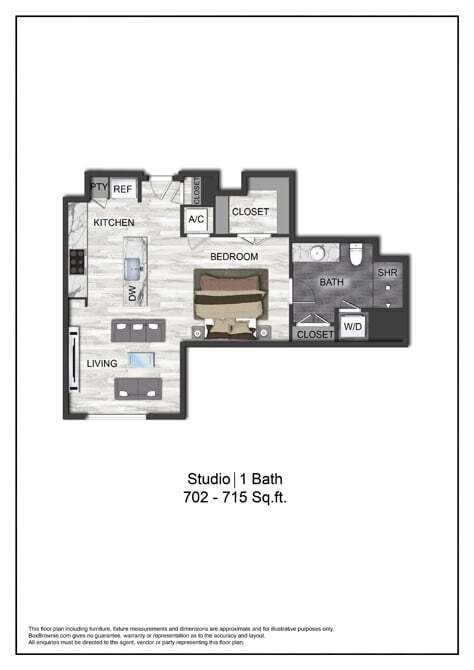 Apartment Model: E2$1,666Studio, 1 Bath, 702 sq ftAvailable NowFloor plans are artist's rendering. All dimensions are approximate. Actual product and specifications may vary in dimension or detail. Not all features are available in every rental home. Please see a representative for details.