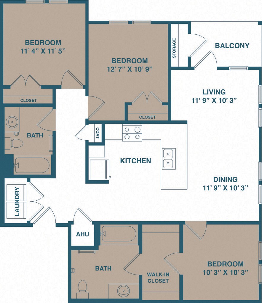 3 Beds, 2 Baths, 1146-1156 sq ftAvailable NowLargest 3 BedroomThis is the largest 3 Bedroom at this PropertyModel Gallery