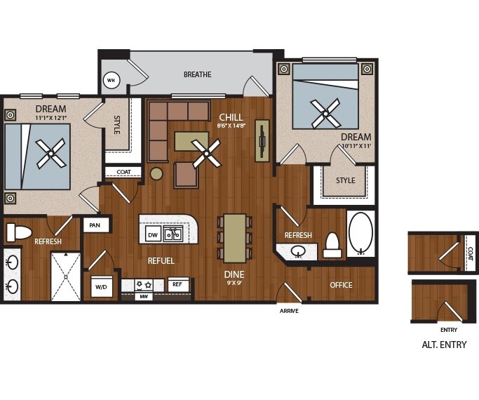 Avion on Legacy offers modern one-, two- and three-bedroom apartments featuring upgraded lighting and private patios / balconies. Our layouts are perfect for working from home which feature built-in desks and large windows to provide ample sunlight. Community amenities include electric vehicle charging stations, an outdoor lounge with fire features, business center, private screening room and catering kitchen. We are located in Grayhawk, just three minutes to Henkel and 12 minutes to Kierland Commons. Enjoy easy freeway access with Loop 101 less than one mile away. We are less than 15 minutes to Mayo Clinic Phoenix, five minutes to HonorHealth Thompson Peak Medical Center and ten minutes to Desert Ridge and Banner Health Center. Apartment features are available in select homes.