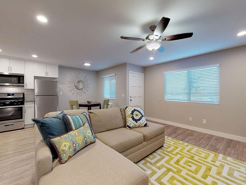 Welcome to our modern 2-bedroom, 1-bathroom apartment located in the heart of Fallbrook, CA. This newly renovated unit features an open concept living area with designer tile and wood style flooring throughout. The kitchen is equipped with stainless steel appliances, including a refrigerator and microwave, as well as new quartz countertops and custom cabinets. Enjoy the convenience of an oversized kitchen sink and in-unit stackable washer/dryer. Stay comfortable year-round with A/C and ceiling fans in every room. Off-street parking is available for residents, and furry friends are welcome in our pet-friendly community (ask for details). Take advantage of our on-site pet park for your four-legged companions. Experience modern living at its finest in this stylish and convenient apartment.