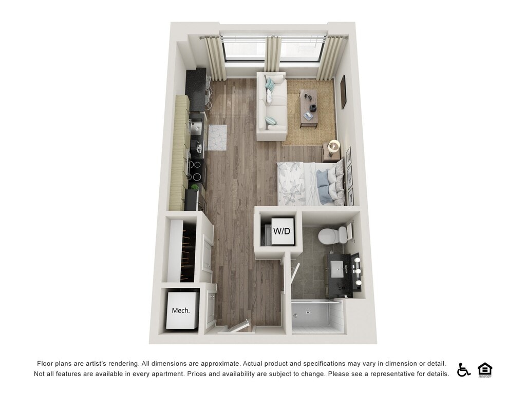 Apartment Model: Studio A$1,380Studio, 1 Bath, 421-428 sq ftAvailable January 27, 2026Floor plans are artist's rendering. All dimensions are approximate. Actual product and specifications may vary in dimension or detail. Not all features are available in every rental home. Prices and availability are subject to change. Base rent is based on monthly frequency. Additional fees may apply, such as but not limited to package delivery, trash, water, amenities, etc. Deposits vary. Please see a representative for details.