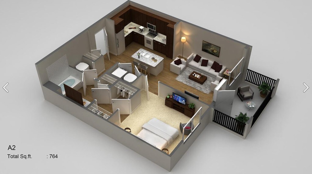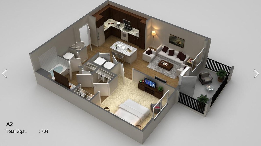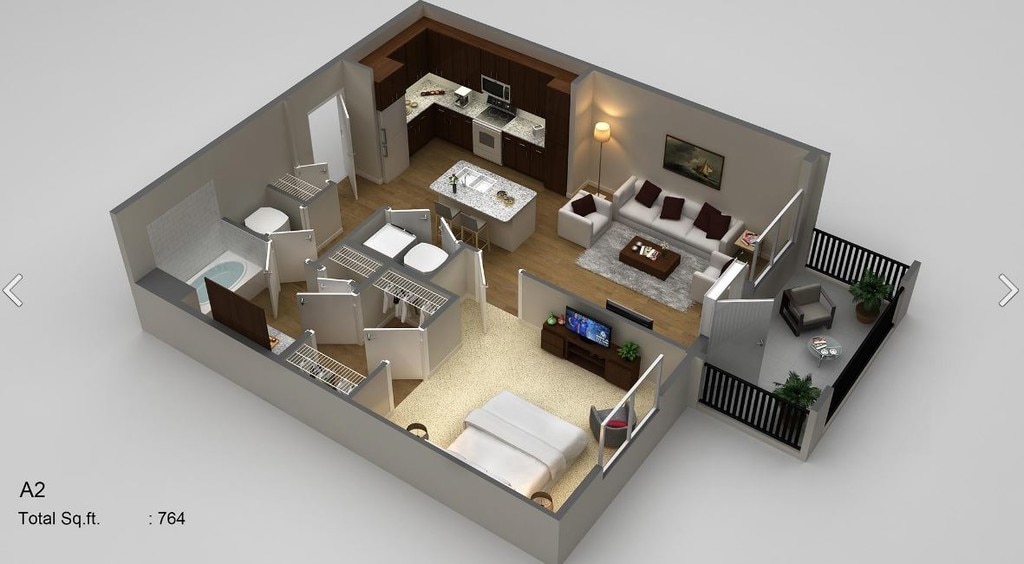 1 Bed, 1 Bath, 764 sq ftModel Gallery
