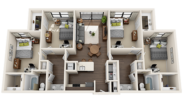 Diligent - Floorplan 8 Apartment Unit: PrivateApartment Model: Diligent$1,2882 Bedroom, 2 Bath, 1030 sq ftAvailable NowApartment Unit: PrivateApartment Model: Diligent$1,2882 Bedroom, 2 Bath, 1030 sq ftAvailable August 14, 20264 Bedrooms