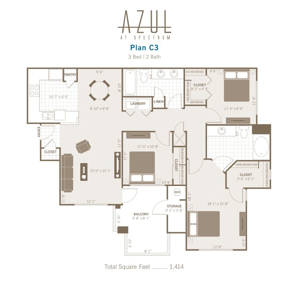 Apartment Model: Three Bedroom/Two Bath (c1-205)3 Bedroom, 2 Bath, 1414 sq ftUnavailableFloorplansPhotos![]()