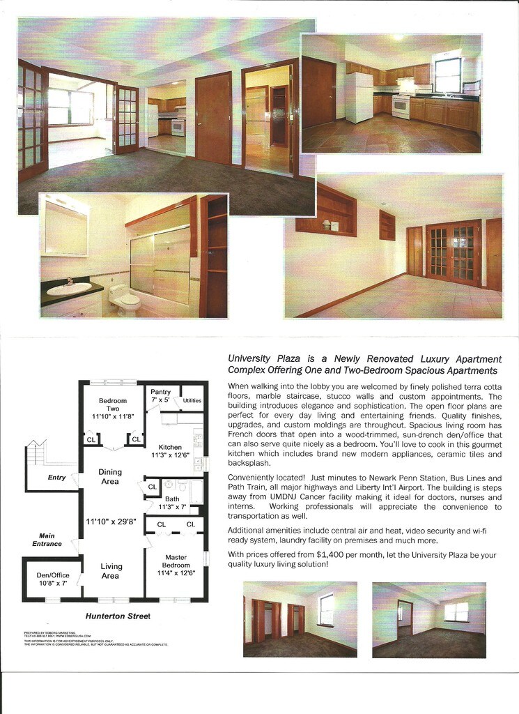 Would you like to live close to New York City for half the price? Newark is New York’s backyard, where our complex is located. We are located across from Rutgers Medical and Dental School and our complex is a few blocks away from Newark Penn Station. You could be in NYC within 15 to 20 minutes. We also have a major new Shopping Center a few blocks away for numerous shopping stores. All apartments are equipped with central air and heat, stone kitchen floors, deco-stain wood trim, and kitchen pantry. Floors are either hardwood or carpeted. Our building also has its own laundry facility and property is well secured. If you desire to be close to NYC in a cost efficient way (Either Work or Leisure)give us a call. Just minutes access to NJ Turnpike, Route 78, I-280 and NJ Parkway and public transportation. New Yorkers ,professionals and graduated students in need of quality housing opportunity should inquire regarding our 2 bedroom units,and studio units. Give us a call and you will find our units very attractive and well priced. Limited supply available (973-876-8087)