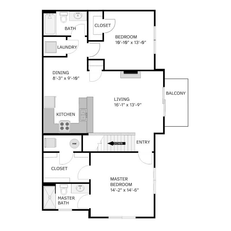 Apartment Model: 2 Bedroom 2 Bathroom - Upper Split$1,7152 Bedroom, 2 Bath, 1133 sq ftAvailable December 1, 2025![]()