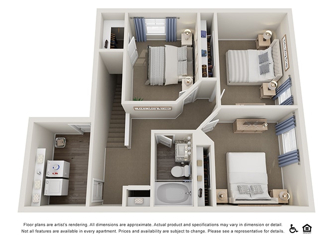 Apartment Model: LakesideCall For Rates3 Bedroom, 2.5 Bath, 1850 sq ftUnavailableFloor plans are artist's rendering. All dimensions are approximate. Actual product and specifications may vary in dimension or detail. Not all features are available in every rental home. Prices and availability are subject to change. Base rent is based on monthly frequency. Additional fees may apply, such as but not limited to package delivery, trash, water, amenities, etc. Deposits vary. Please see a representative for details.