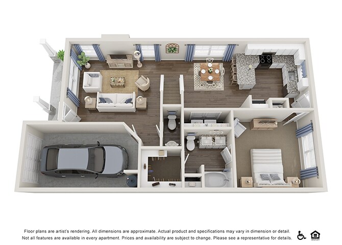 Juniper - Floorplan 1 Floor plans are artist's rendering. All dimensions are approximate. Actual product and specifications may vary in dimension or detail. Not all features are available in every rental home. Prices and availability are subject to change. Base rent is based on monthly frequency. Additional fees may apply, such as but not limited to package delivery, trash, water, amenities, etc. Deposits vary. Please see a representative for details.