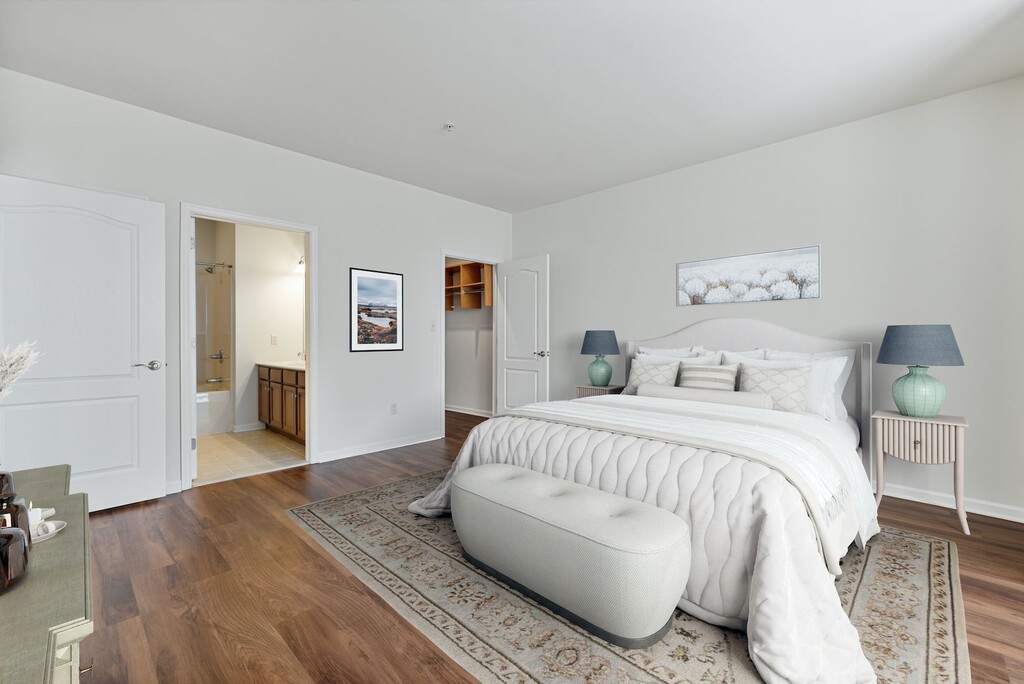 The Devon II is a second-floor end-unit, sun-lit apartment featuring nine-foot ceilings and vaulted ceilings in select rooms. The open entry two-story foyer leads to a majestic living room with a corner gas fireplace and TV niche. A half-wall defines the dining room, while the open island kitchen with a breakfast bar is complimented by granite countertops, gas cooking, and GE appliances. Dual master suites each with vaulted ceilings, spacious walk-in closets, and private baths complete with double vanities and soaking tubs. Master Suite 1 also features a second closet, large sitting area, and oversized separate shower. A one-car direct access heated garage is located on the first floor. *Rental Rate quoted is subject to change based upon lease term.