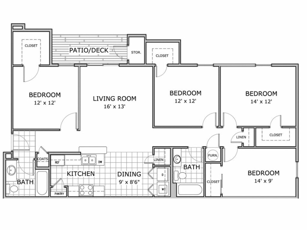4 Bedroom - Ph 1 - Floorplan 1 Apartment Unit: A-37Apartment Model: 4 Bedroom - Ph 14 Bedroom, 2 Bath, 1475 sq ftAvailable December 31, 20254 Bedroom - Ph 2
