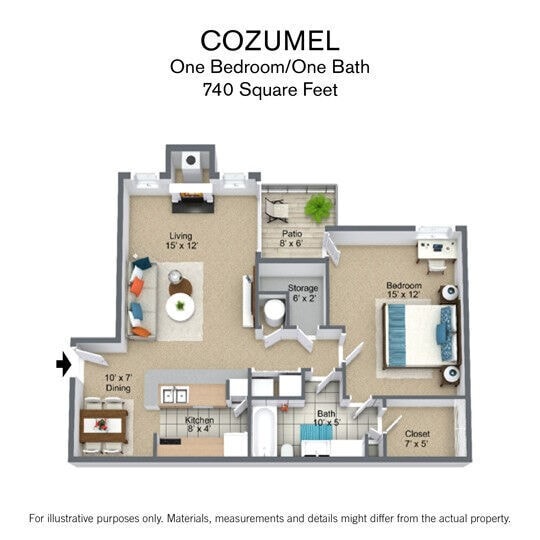 Apartment Model: CozumelFrom $1,1551 Bedroom, 1 Bath, 740 sq ftAvailable November 28, 2025FloorplansPhotos![]()
