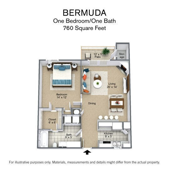 Apartment Model: BerumudaFrom $1,1751 Bedroom, 1 Bath, 760 sq ftAvailable NowFloorplansPhotos![]()