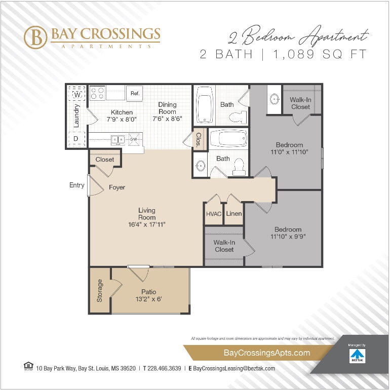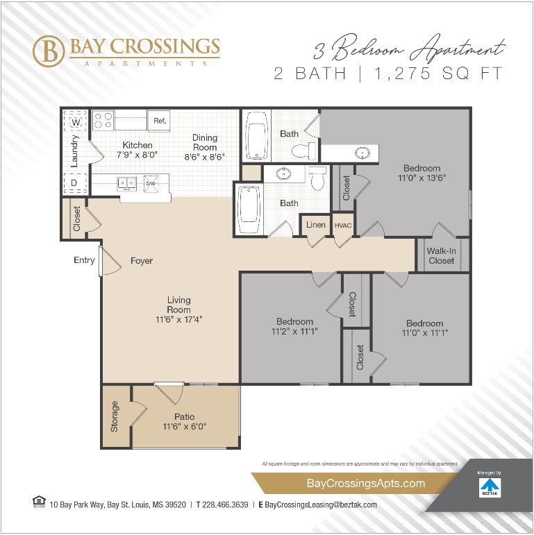 Bay Crossings Apartments is located in the 39520 Zip code of Bay St. Louis, MS. This community is professionally managed by BEZTAK Properties