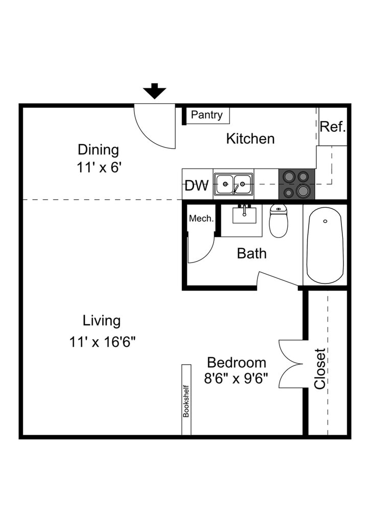 Apartment Model: 1BR1BA Down NC$8701 Bedroom, 1 Bath, 650 sq ftUnavailable1BR1BA Down NC - Floorplan 1 1br1ba 753Sq.Ft.