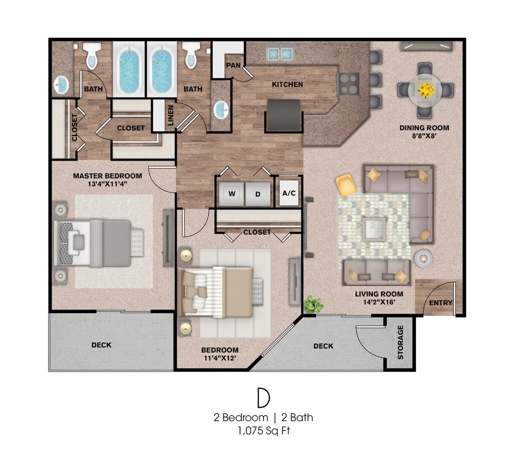 - 2 Bedrooms- The Trinity- From $1,3892 Beds, 2 Baths, 1075 sq ftAvailable Now- Model Gallery- Floorplans- Photos- Availability Details- Price - Availability Date - Unit - Sq Ft - Deposit - View Details - $1,449 - Available Now - 11 - 1075 - $250 - $1,389 - Available Now - 12 - 1075 - $250 - $1,449 - Available Now - 13 - 1075 - $250 - Model Amenities and Features- Features- Air Conditioning