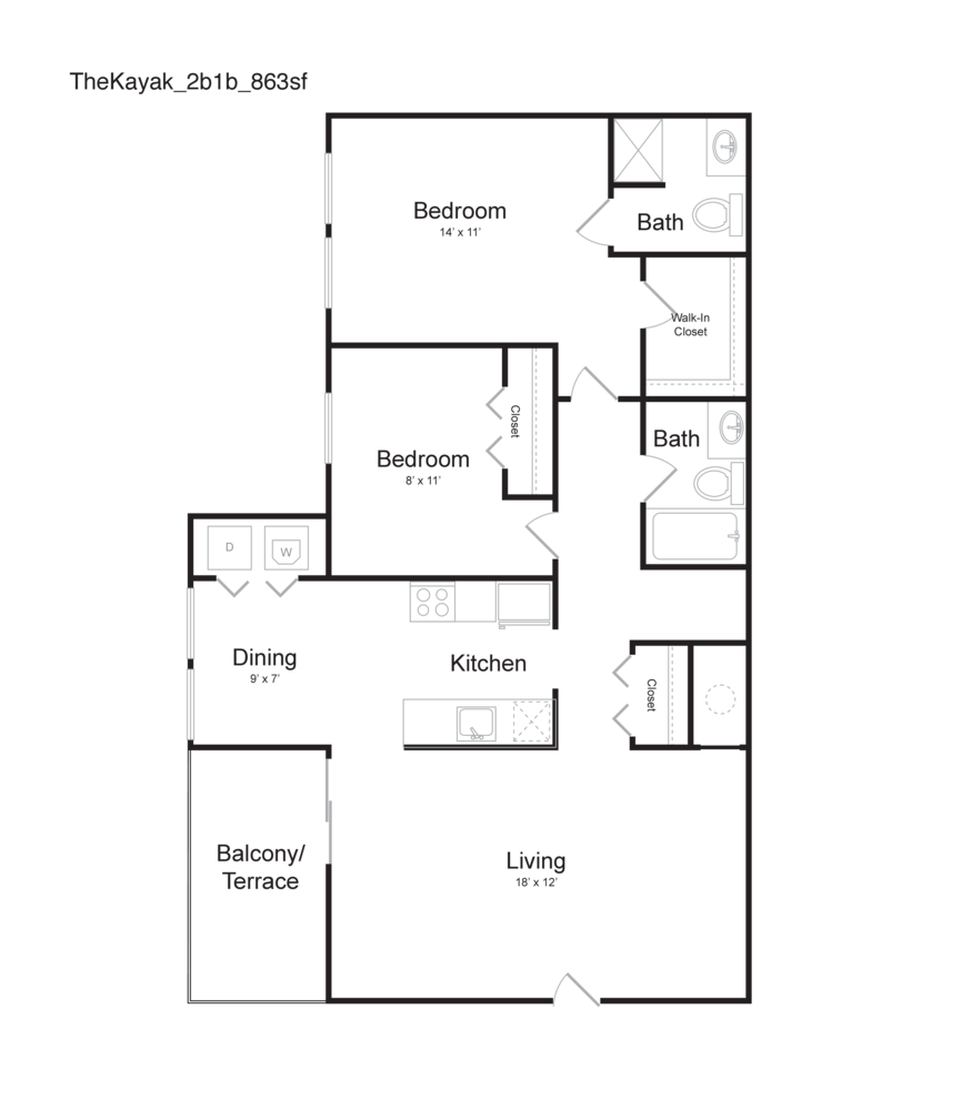 Apartment Model: KayakFrom $1,8142 Bedroom, 1 Bath, 863 sq ftAvailable NowFloor plans are artist's rendering. All dimensions are approximate. Actual product and specifications may vary in dimension or detail. Not all features are available in every rental home. Prices and availability are subject to change. Base rent is based on monthly frequency. Additional fees may apply, such as but not limited to package delivery, trash, water, amenities, etc. Deposits vary. Please see a representative for details.