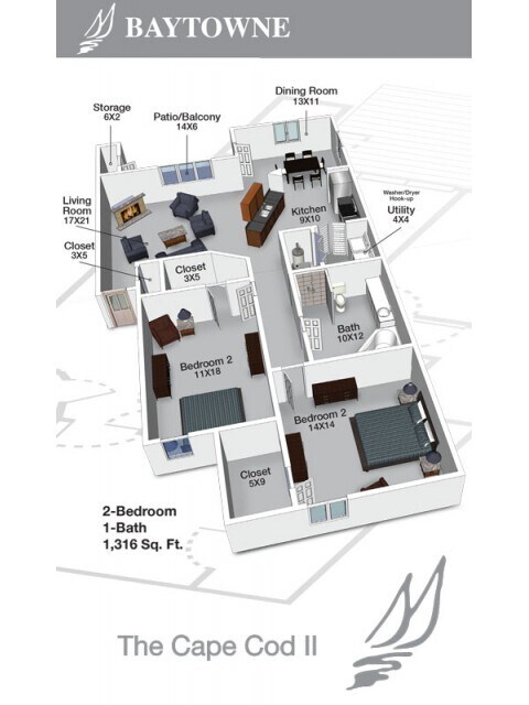 Apartment Model: Cape Cod III$1,6202 Bedroom, 1 Bath, 1382 sq ftUnavailable![]()