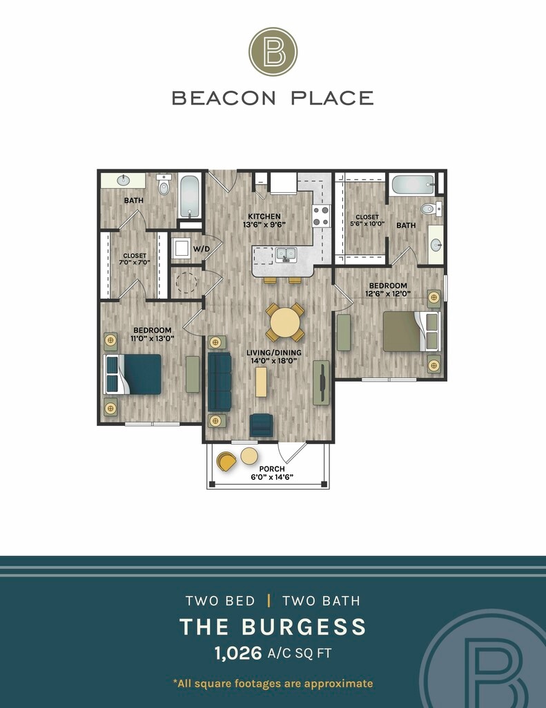 Apartment Model: Burgess-2x2$1,6152 Bedroom, 2 Bath, 1026 sq ftAvailable NowFloorplansPhotos![]()