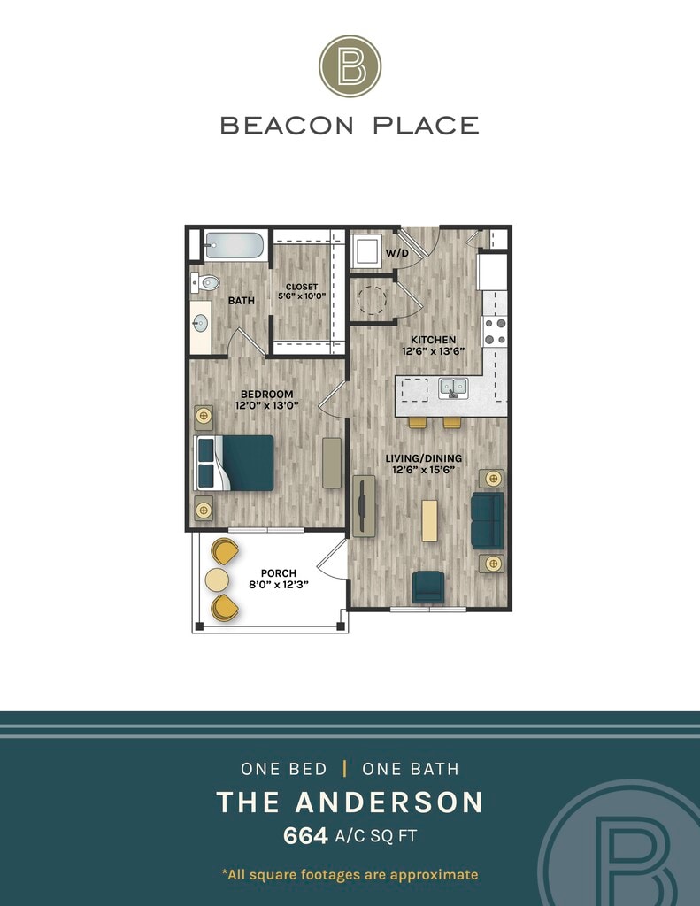 Apartment Model: Anderson-1x1From $1,3501 Bedroom, 1 Bath, 664 sq ftAvailable Now![]()