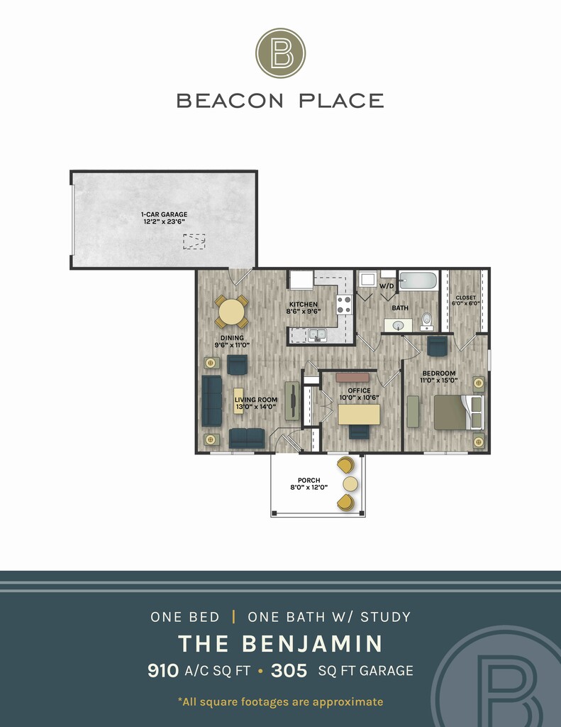 Apartment Model: Benjamin-1x1 Study$1,5952 Bedroom, 1 Bath, 910 sq ftAvailable Now![]()
