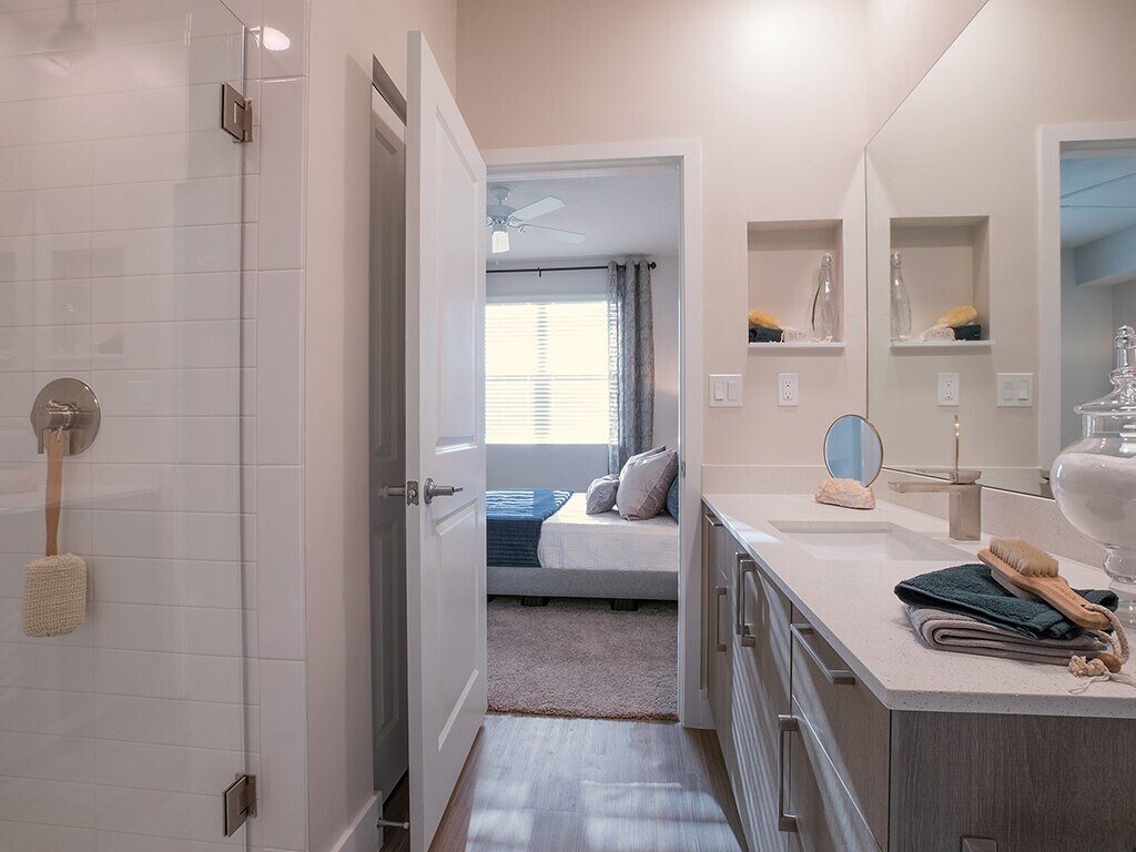 - Dual vanities in select apartments