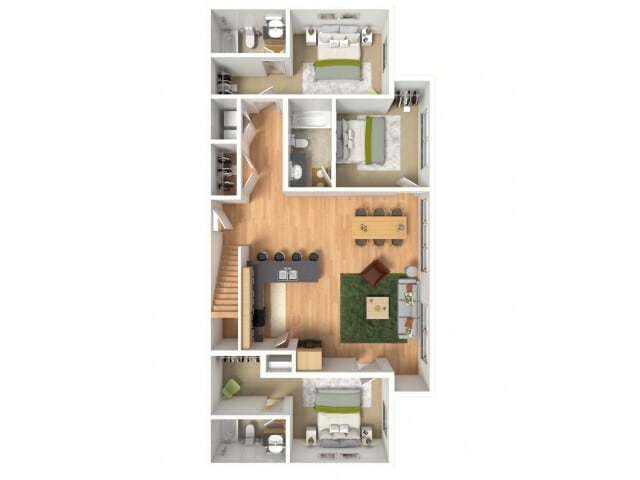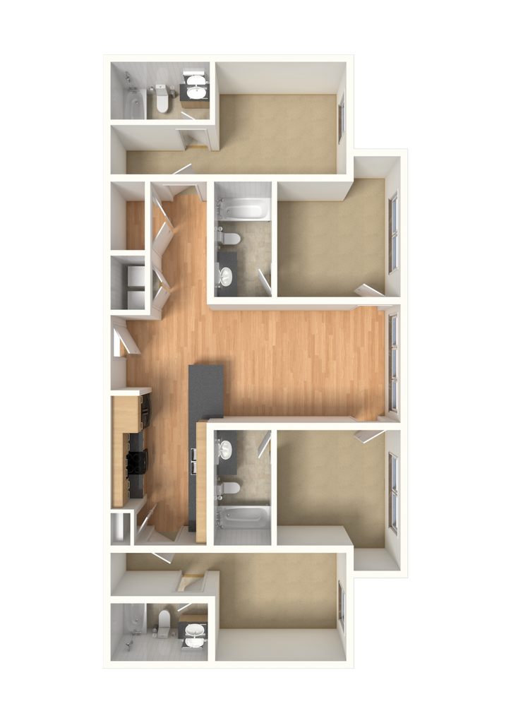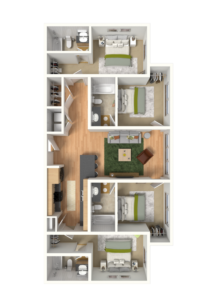 4x4 - Floorplan 4 Apartment Unit: PrivateApartment Model: 4x4$5354 Bedroom, 4 Bath, 1302 sq ftAvailable NowApartment Unit: PrivateApartment Model: 4x4$5354 Bedroom, 4 Bath, 1302 sq ftAvailable August 12, 20265 Bedrooms