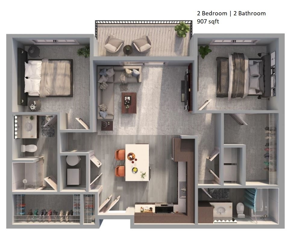 2 Beds, 2 Baths, 907 sq ftModel Gallery