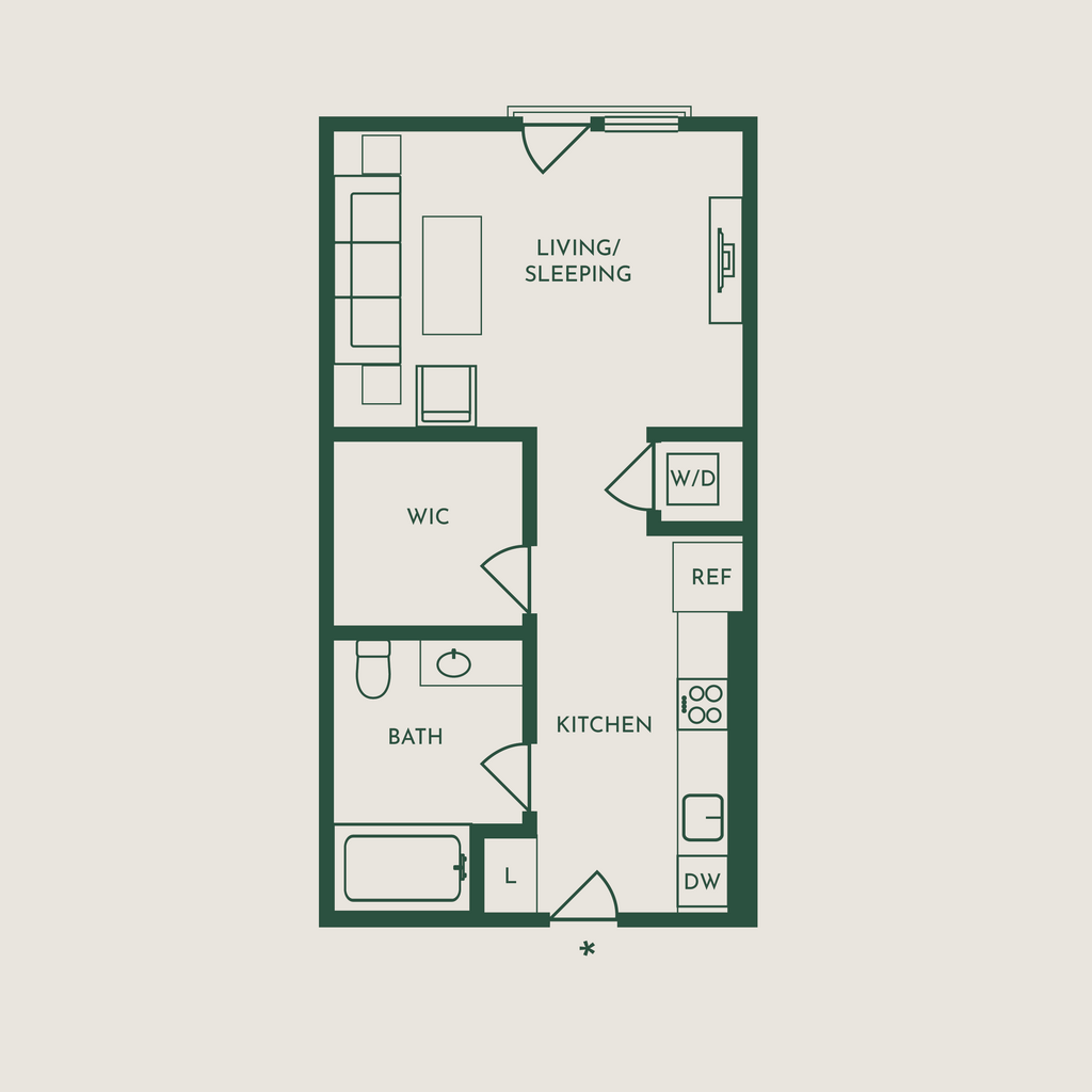S1 - Floorplan 2 Apartment Unit: 261Apartment Model: S1$2,105Studio, 1 Bath, 502 sq ftAvailable Now![]()