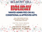 The current rent special at Belmont Hill Apartments is: HOLIDAY SPECIAL!!!~~WAIVED ADMIN FEES ON ALL CONDITIONAL AND APPROVED APPS FOR ANYONE APPLYING THROUGH 12/31..