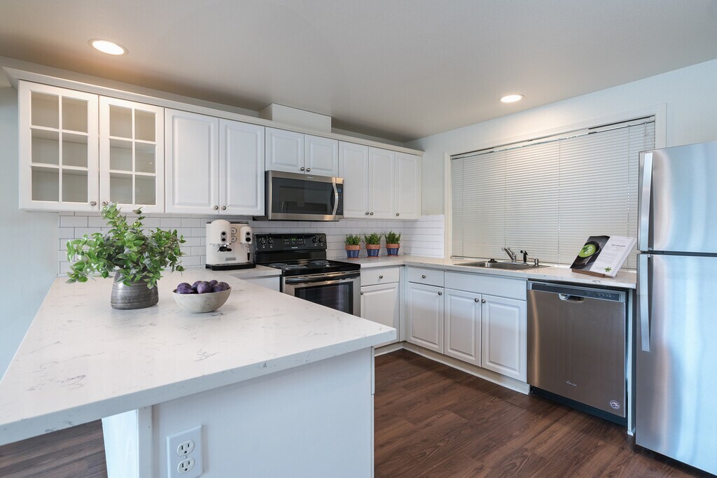 Nestled into a quiet cul-de-sac in the North Houghton neighborhood of Kirkland, this private ten-unit townhouse community is an ideal place to call home. The property grounds are beautifully landscaped and meticulously maintained. An assigned carport and additional parking space are included. The central location provides easy access to major freeways, bus lines and schools. The Benchmark’s two-story townhomes are all 2 bedroom 1.5 bath units well appointed with large chef’s kitchens, wood-burning fireplaces, vaulted ceilings and ample storage and washer/dryer. With spacious private concrete patios, these townhomes are perfect for entertaining. Each home has been beautifully remodeled with granite or Quartz countertops and luxury vinyl wood plank flooring.