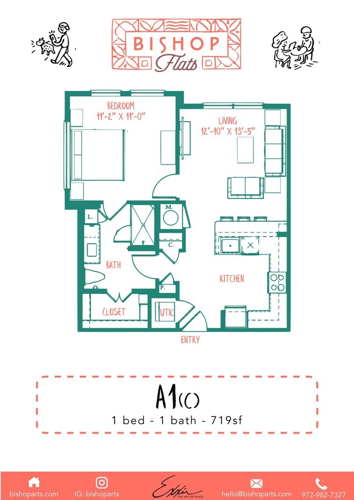 Bishop Flats offers 1 Bedroom apartments starting from $1,739 and having 719–871 sq ft. Here is the current pricing and availability: