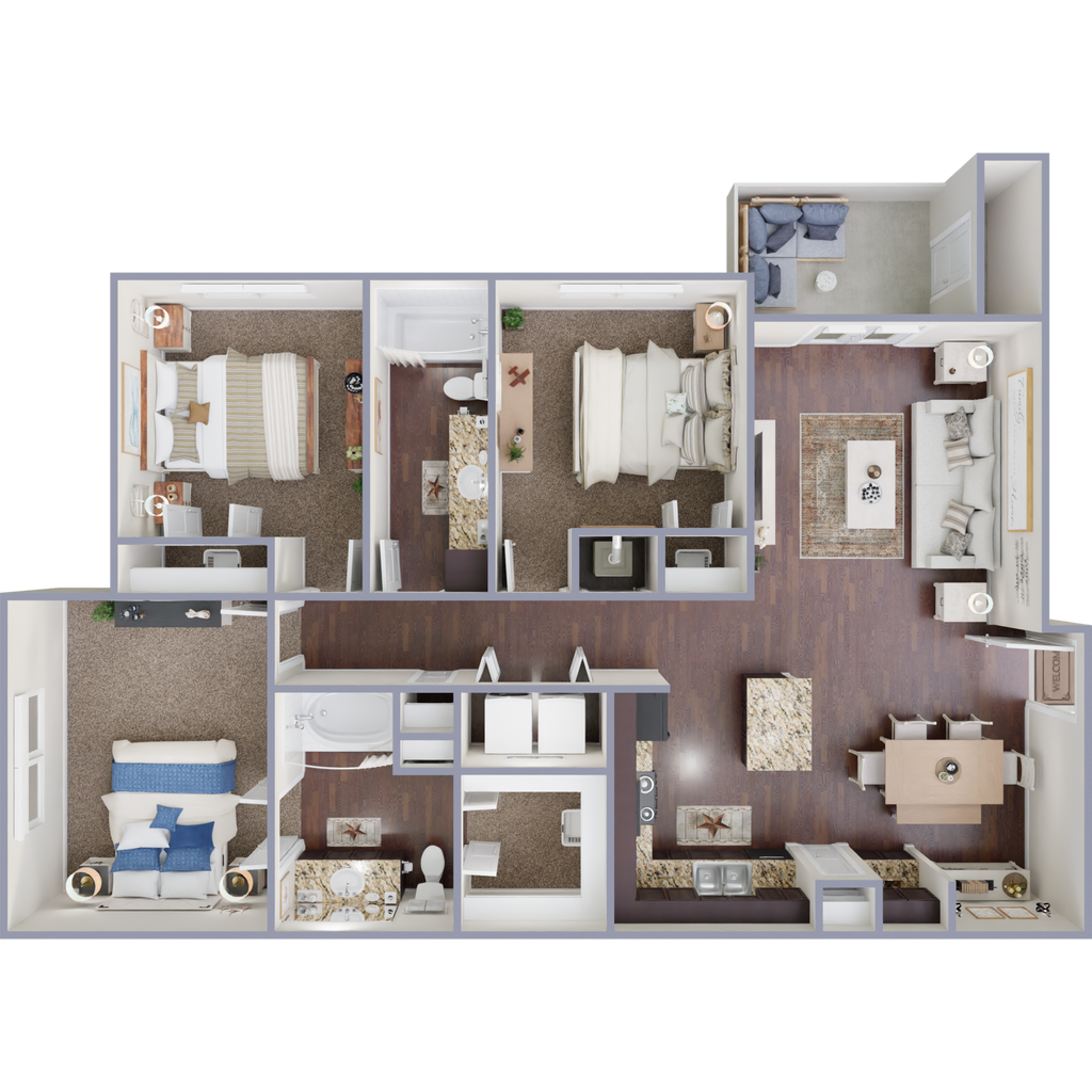 C1 - Floorplan 2 Apartment Unit: 0716Apartment Model: C13 Bedroom, 2 Bath, 1248 sq ftAvailable NowApartment Unit: 0728Apartment Model: C13 Bedroom, 2 Bath, 1248 sq ftAvailable December 10, 2025Three Bedroom