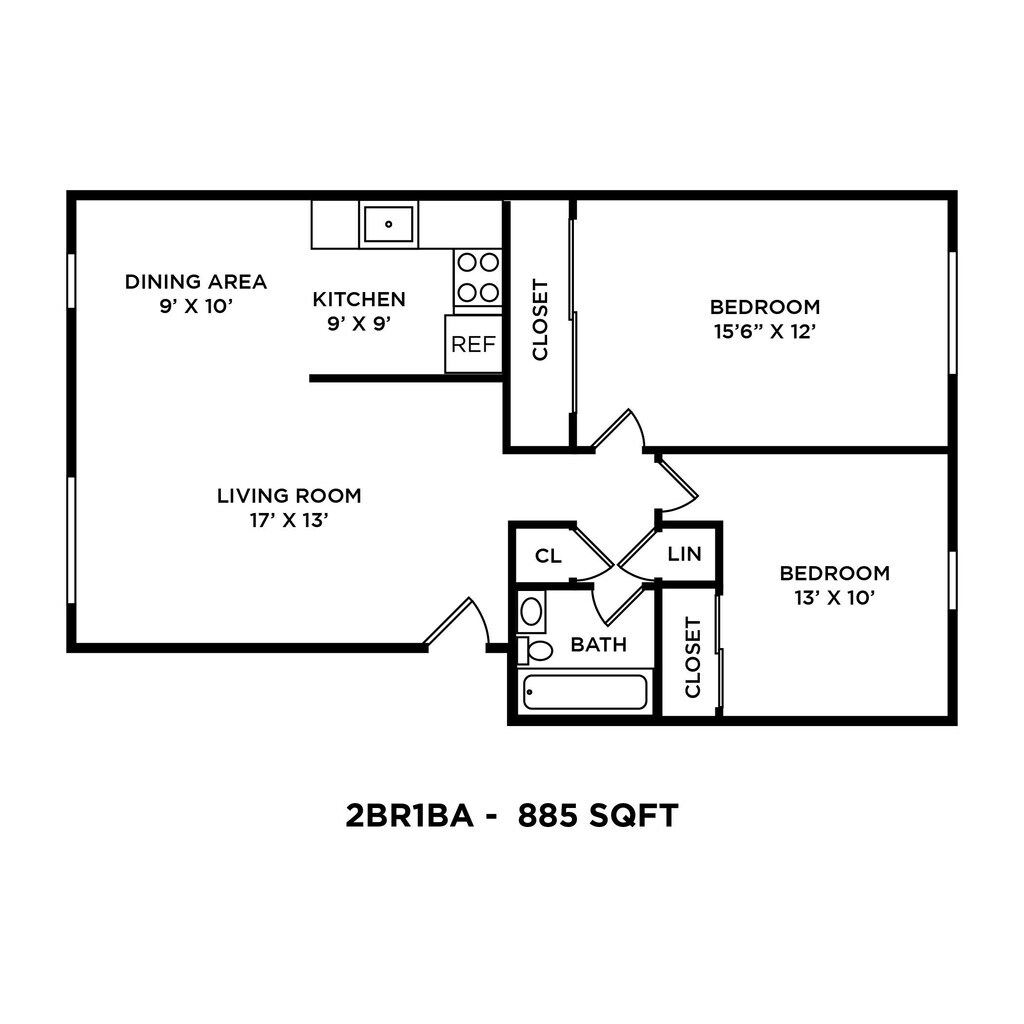 Apartment Model: Two Bedroom - 885 sqftFrom $1,6852 Bedroom, 1 Bath, 885 sq ftAvailable Now![]()