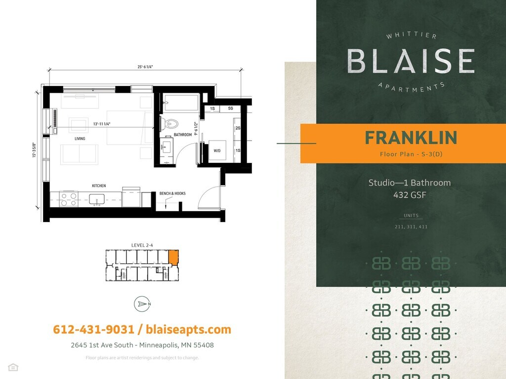 Franklin - Floorplan 6 Apartment Unit: 411Apartment Model: FranklinStudio, 1 Bath, 432 sq ftAvailable NowNicollet