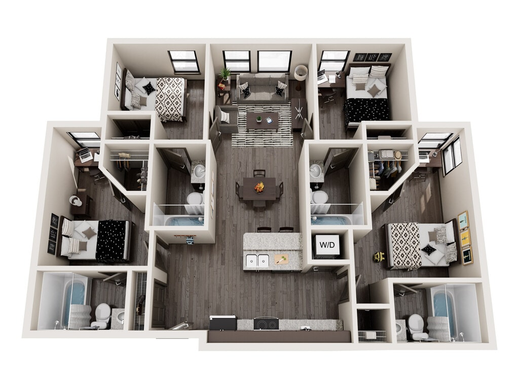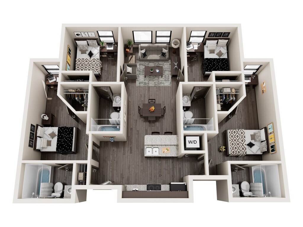 4 Beds, 4 Baths, 1366 sq ftAvailable NowLargest 4 BedroomThis is the largest 4 Bedroom at this PropertyModel Gallery